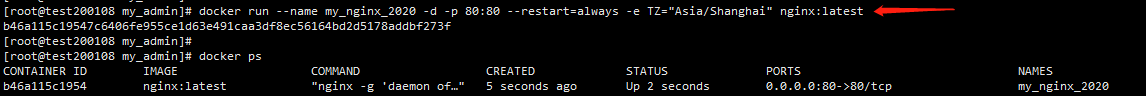 docker run --name my_nginx_2020 -d -p 80:80 --restart=always -e TZ="Asia/Shanghai" nginx:latest