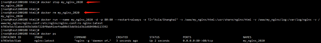 docker run --name my_nginx_2020 -d -p 80:80 --restart=always -e TZ="Asia/Shanghai" -v /www/my_nginx/html:/usr/share/nginx/html -v /www/my_nginx/log:/var/log/nginx -v /www/my_nginx/nginx.conf:/etc/nginx/nginx.conf:ro nginx:latest