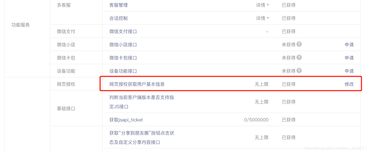 在微信公众平台下的开发->接口权限->网页服务->网页授权中的网页授权获取用户基本信息