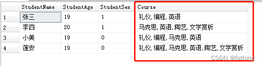 要求查询学生详细信息,课程名称以逗号分隔,查询到结果如下图所示: