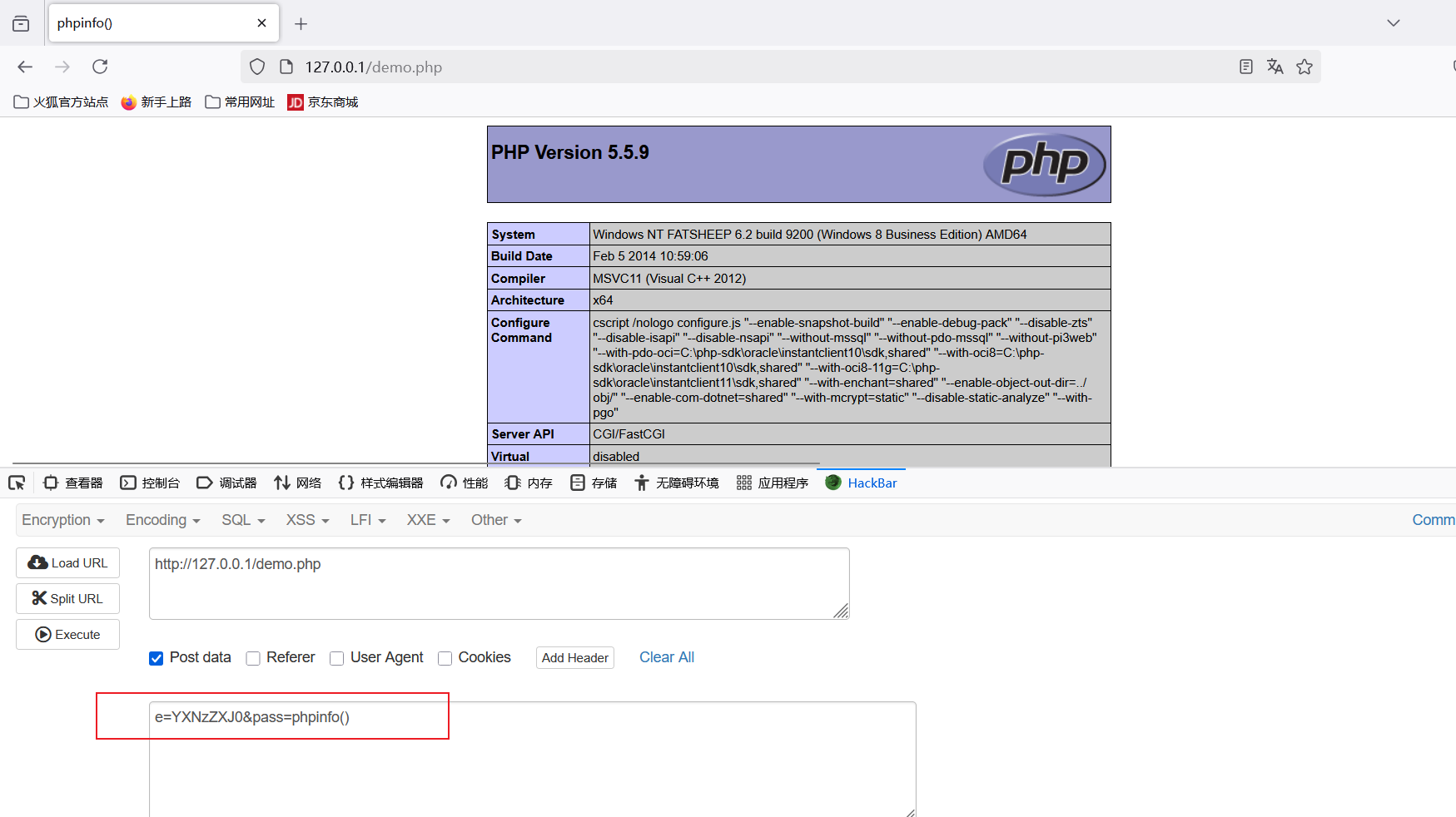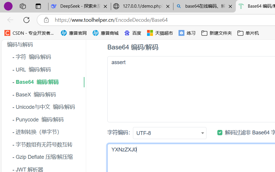分析代码:我传入的是一个e=YXNzZXJ0&pass=phpinfo() ,首先我的e是经过了base64的编码,pass=phpinfo()传入数组=》给了$arr,$arr会将自己的参数传递给解码过后的assert