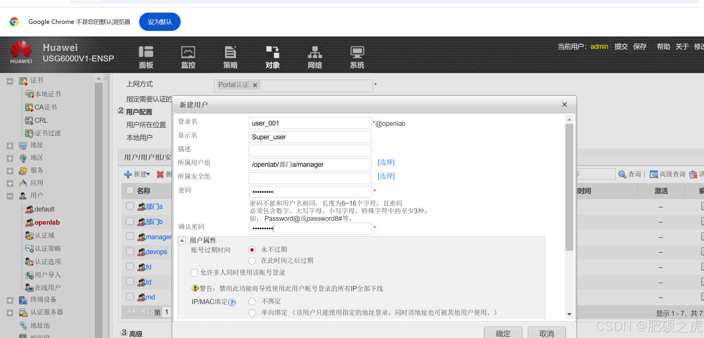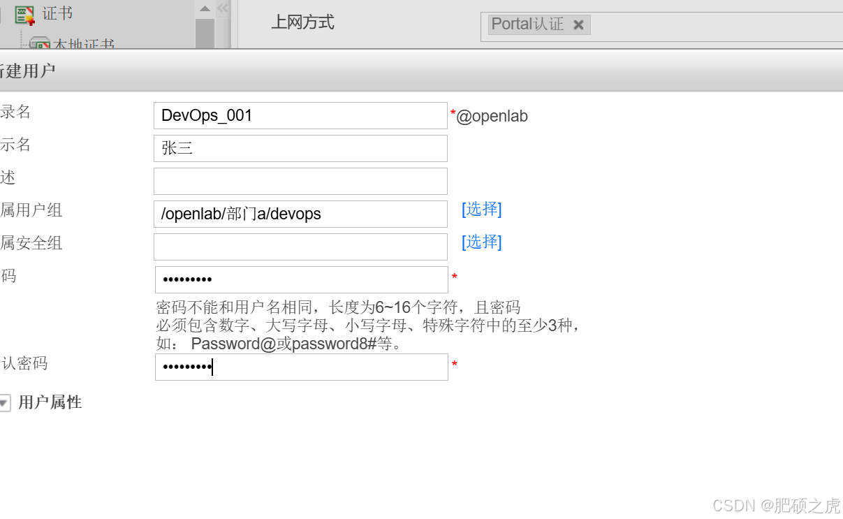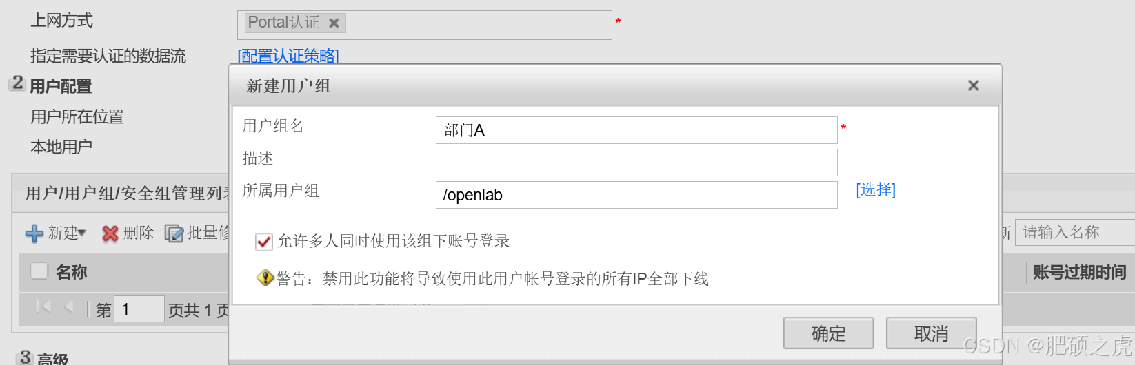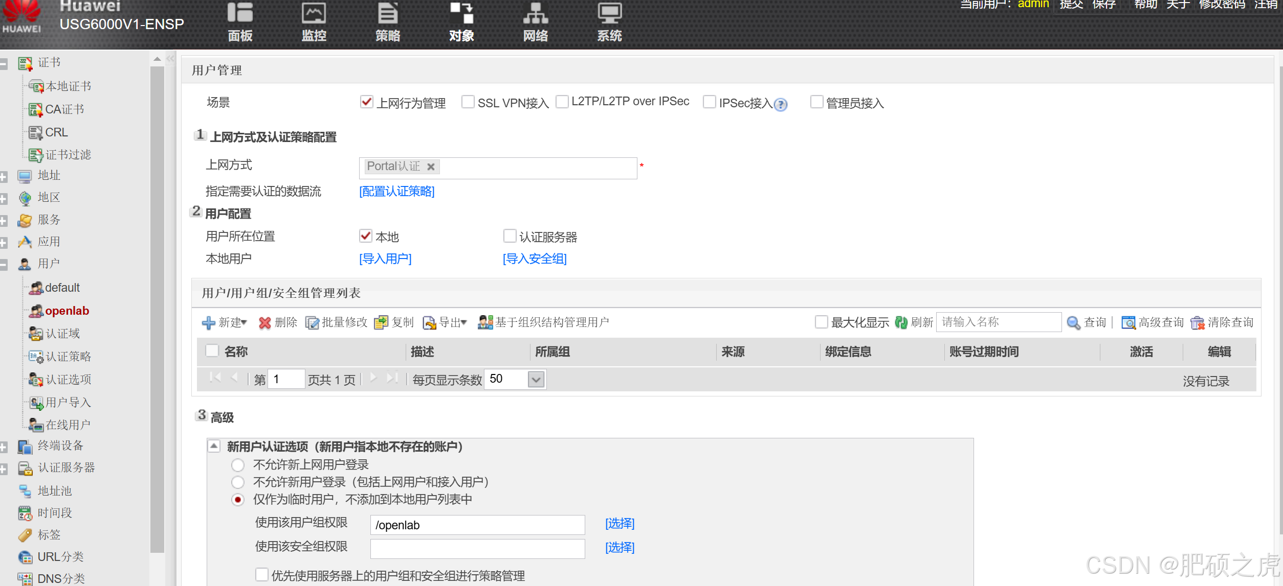在用户下面找到openlab,在里面配置,在场景里只选择一个上网行为管理,上网方式,porlal方式,在高级里选择如下