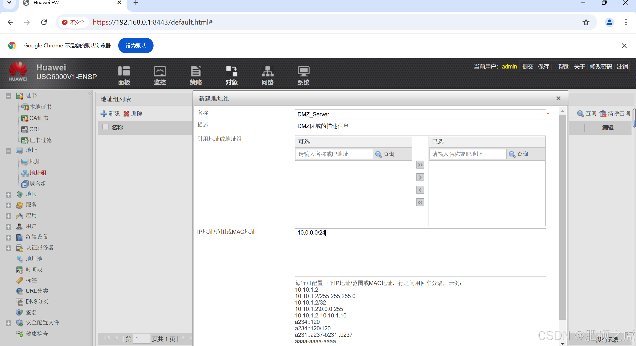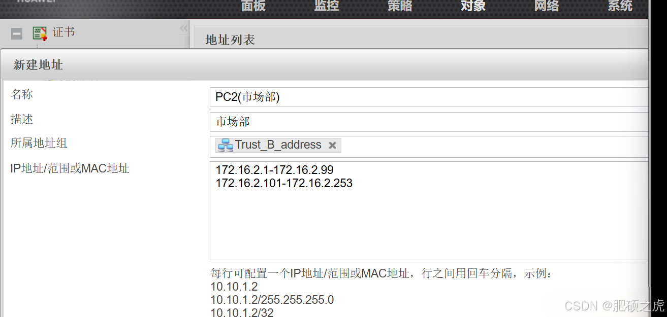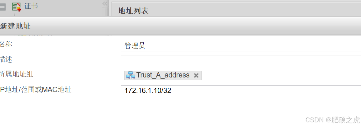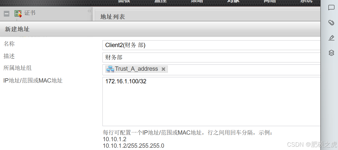 步骤1:创建地址组,点开最上面的对象,在左边的服务里找到地址,在地址下点击地址组,点击新建,根据要求如下完成信息