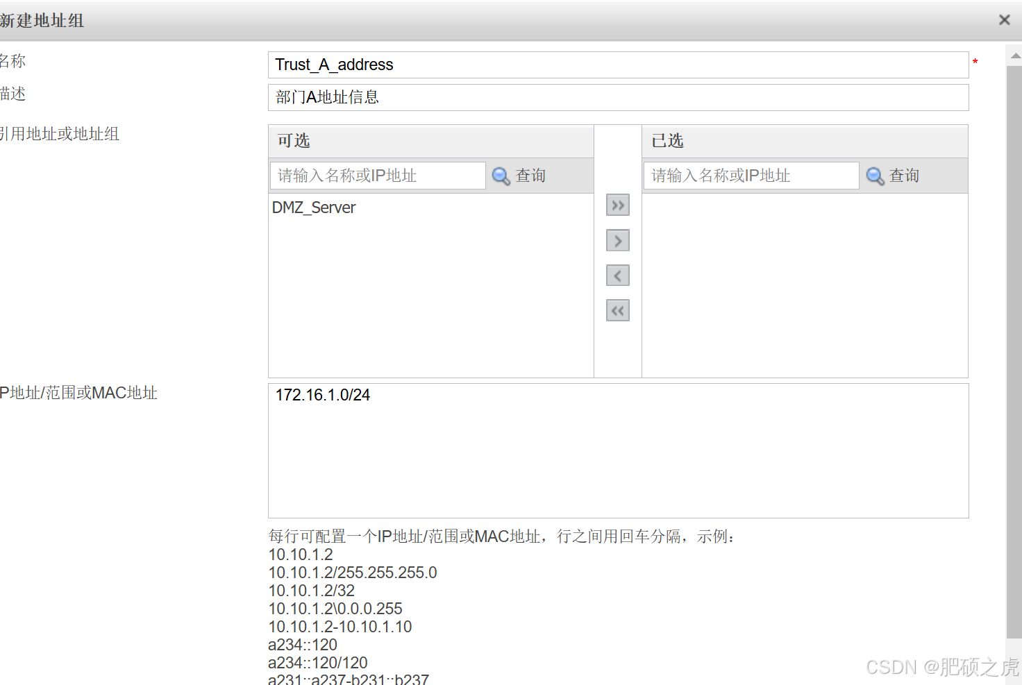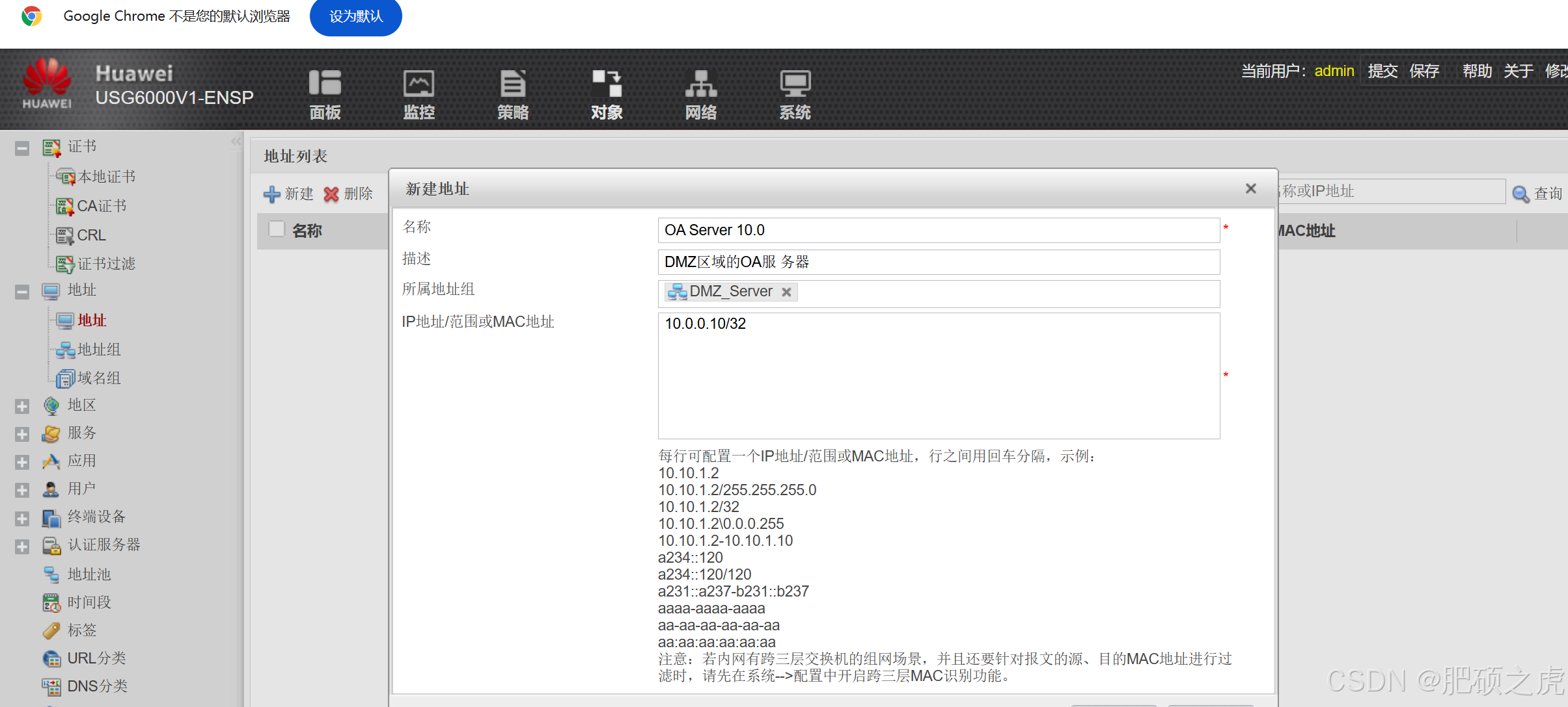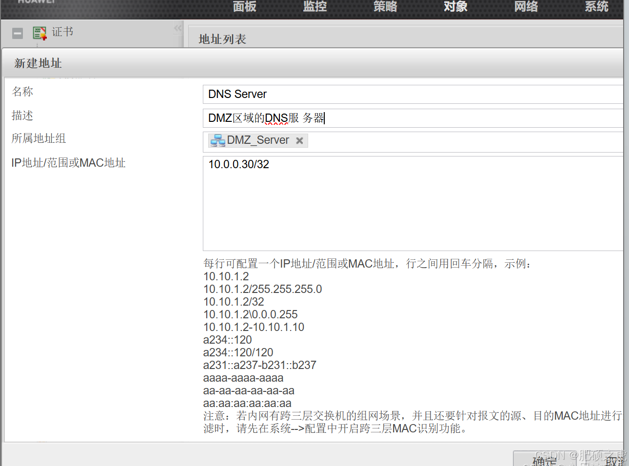 步骤1:创建地址组,点开最上面的对象,在左边的服务里找到地址,在地址下点击地址组,点击新建,根据要求如下完成信息