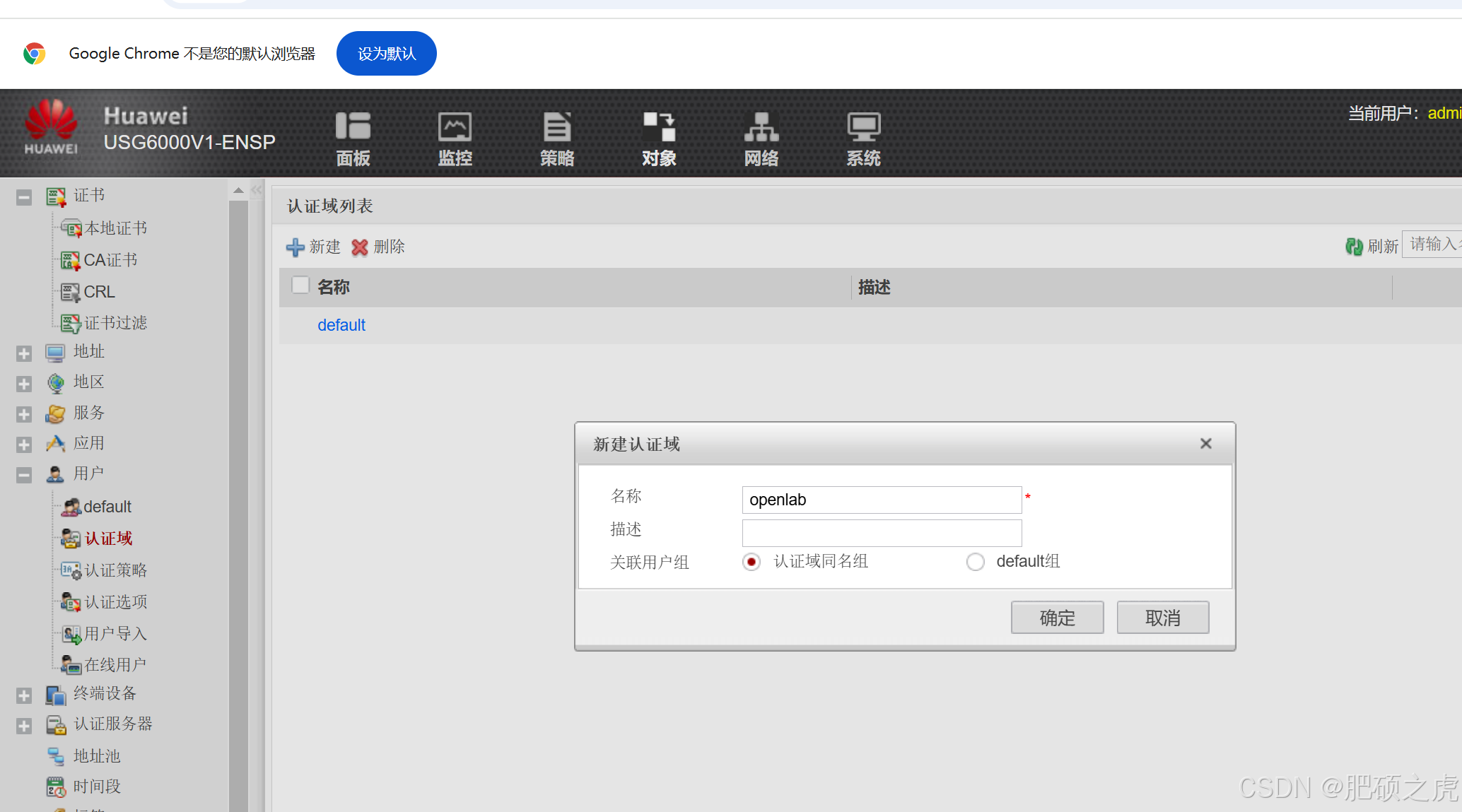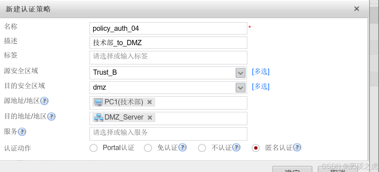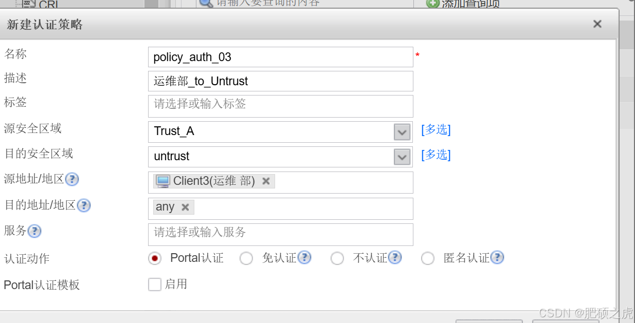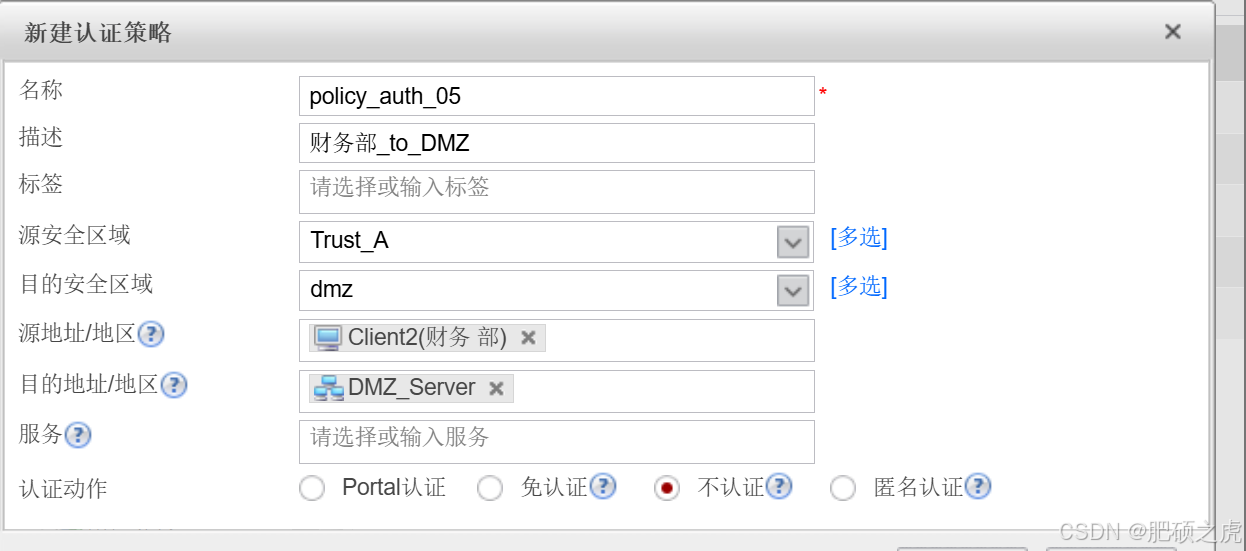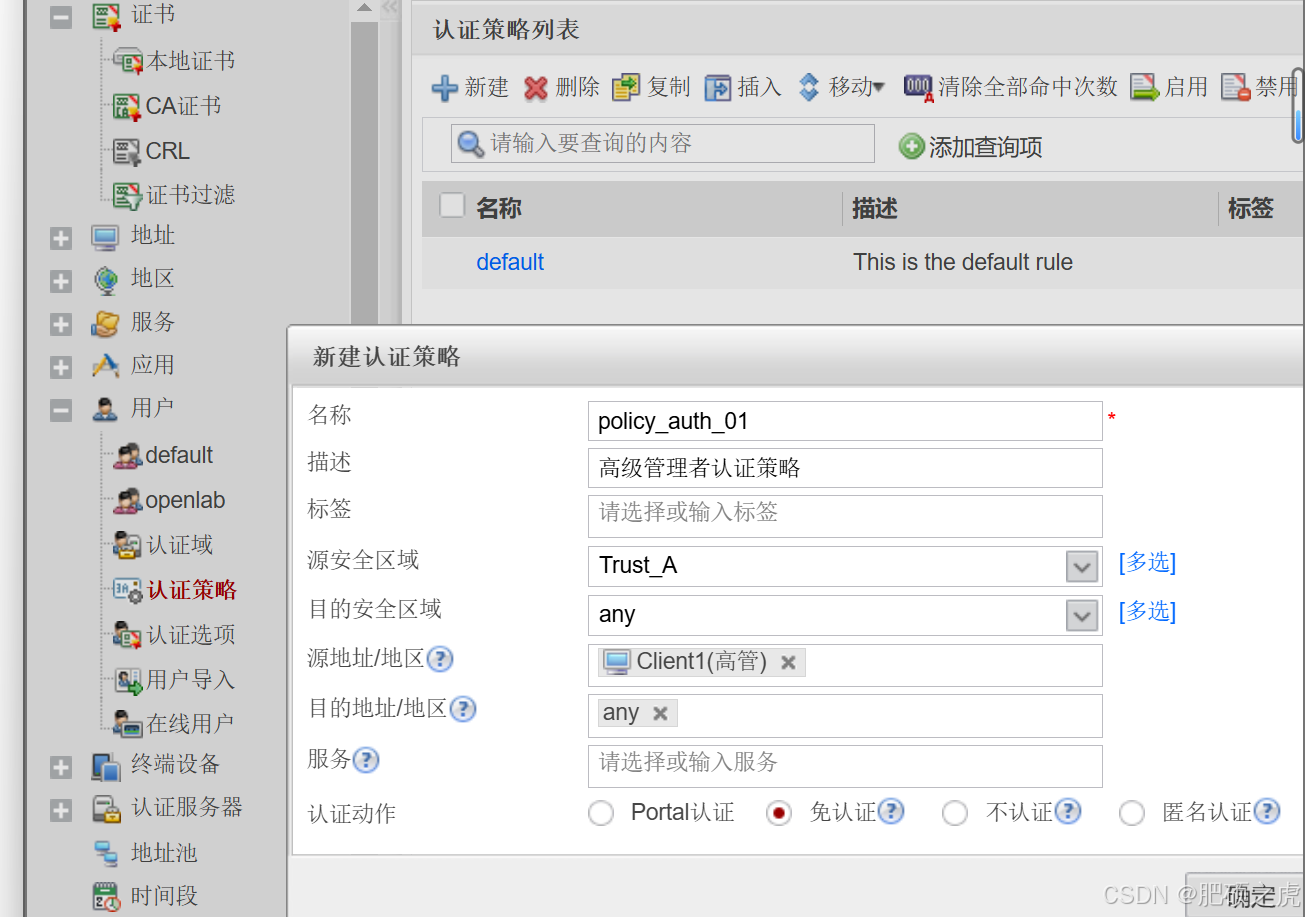 步骤4:配置安全策略:点开最上面的对象,在左边的服务里找到用户,在用户下面找到认证策略,在里面编辑新建