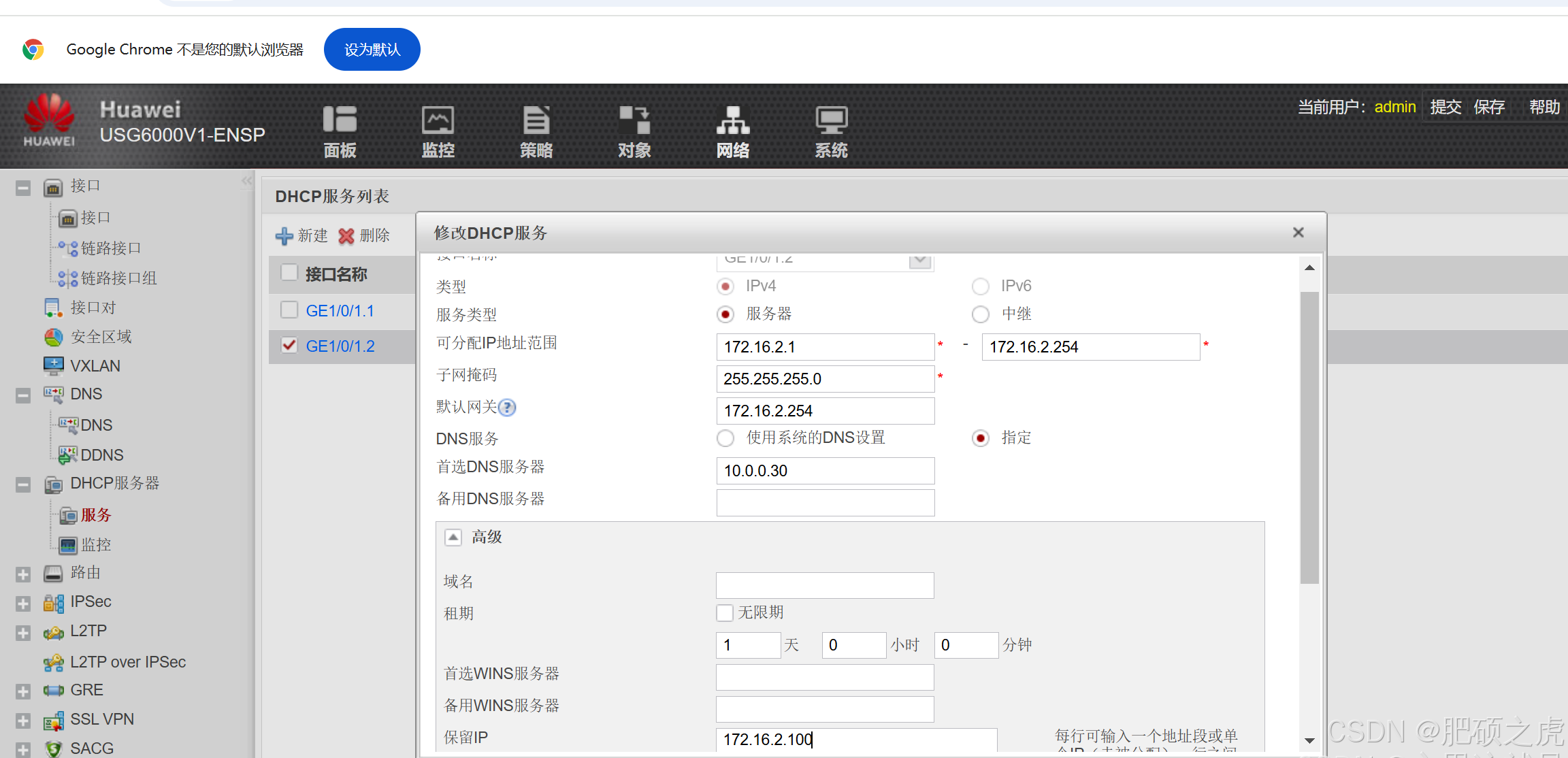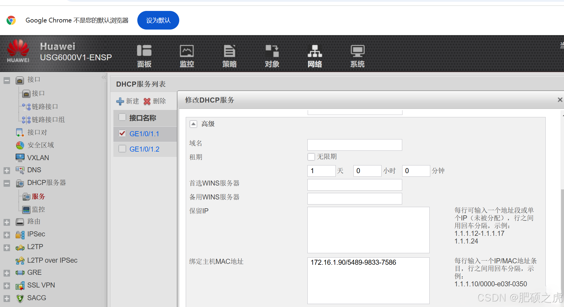在wed上,点开最上面的网络,在左边的服务里找到DHCP服务,在DHCP服务下点击服务,完善GE1/0/1.1信息,最后在绑定主机MAC地址这里,前面写需要下发指定的IP,后面写将IP放给那个指定的设备的mac地址。