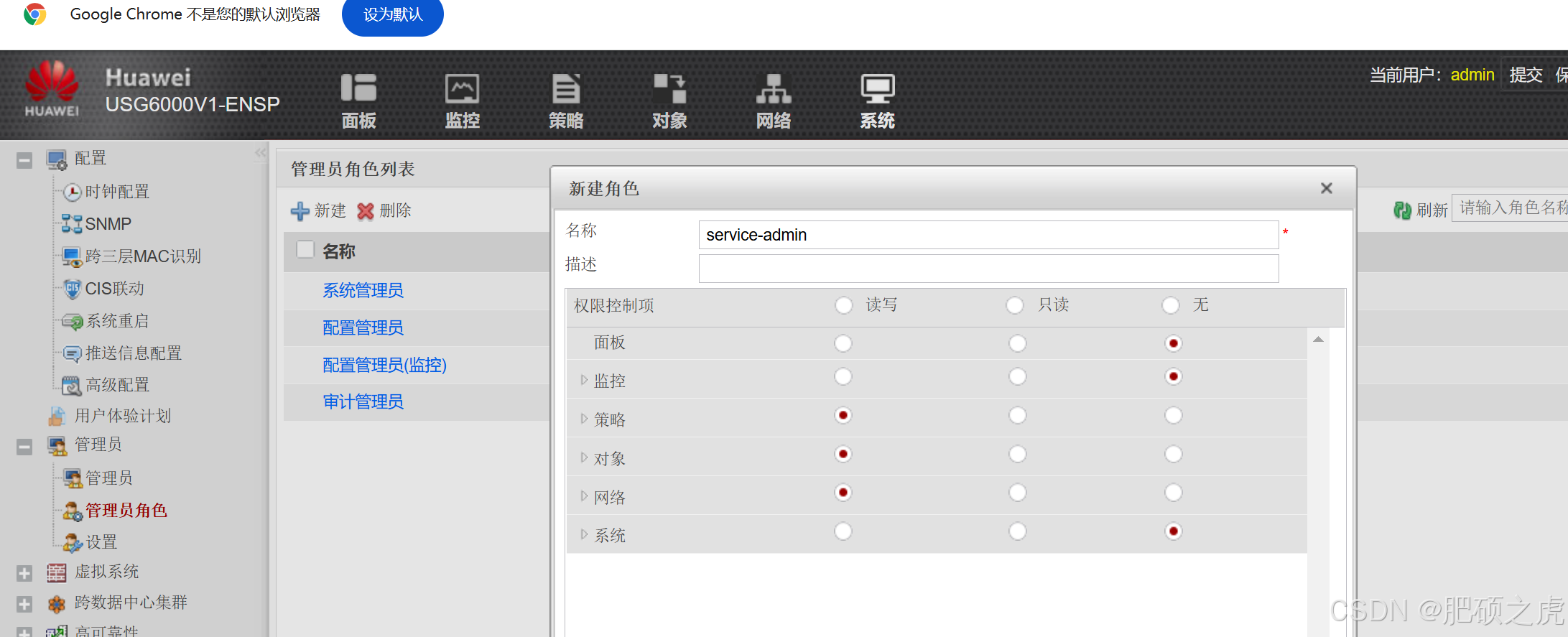 步骤2:创建管理员,点开最上面的系统,在左边的服务里找到管理员,在管理员下面找到管理员角色,在里面编辑新建,根据要求设置名称权限,
