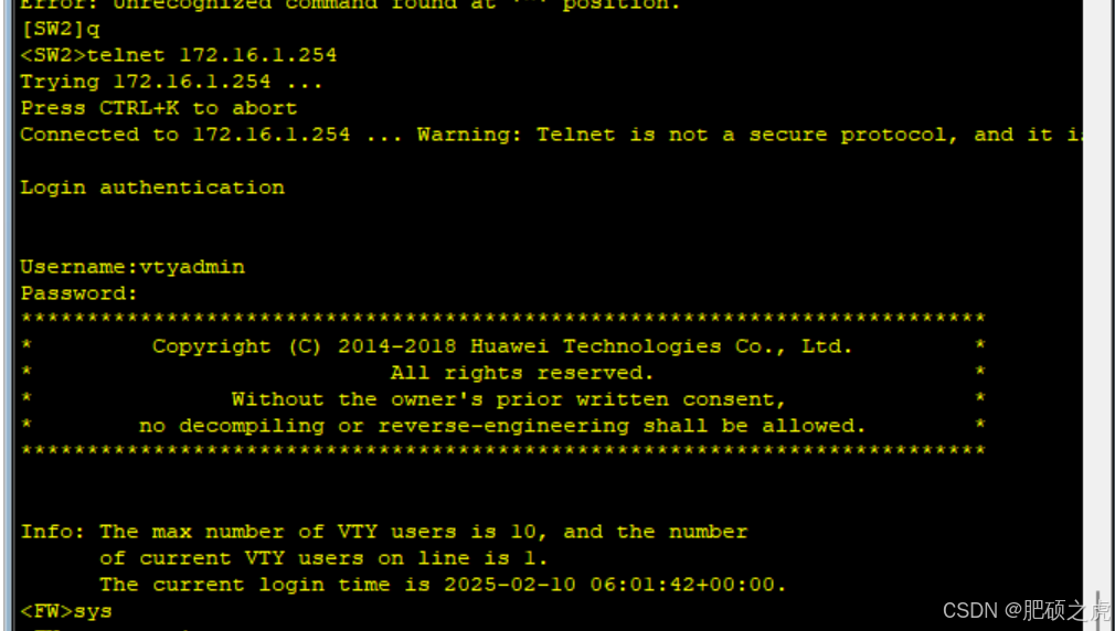 <SW2>telnet 172.16.1.254 登录