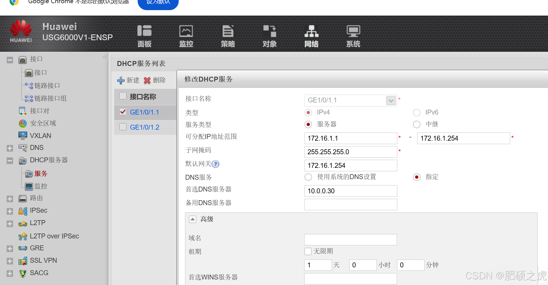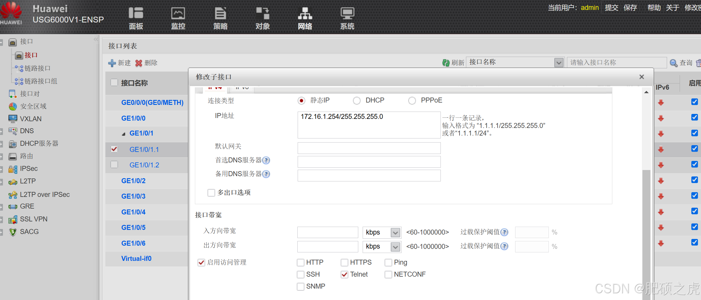 步骤1:开启telnet服务,点开最上面的网络,在左边的服务里找到接口,在接口里面找到GE1/0/1.1,在里面编辑,在最下面勾选telnet