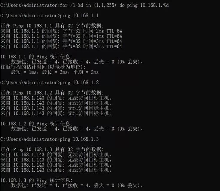 当输入批量命令后,那么它就自动把网段内所有的ip地址都ping完为止。
