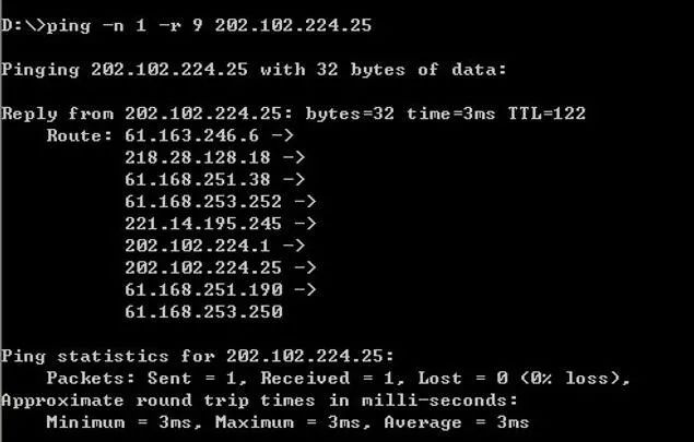 ping -n 1 -r 9 202.102.224.25 (发送一个数据包,最多记录9个路由)