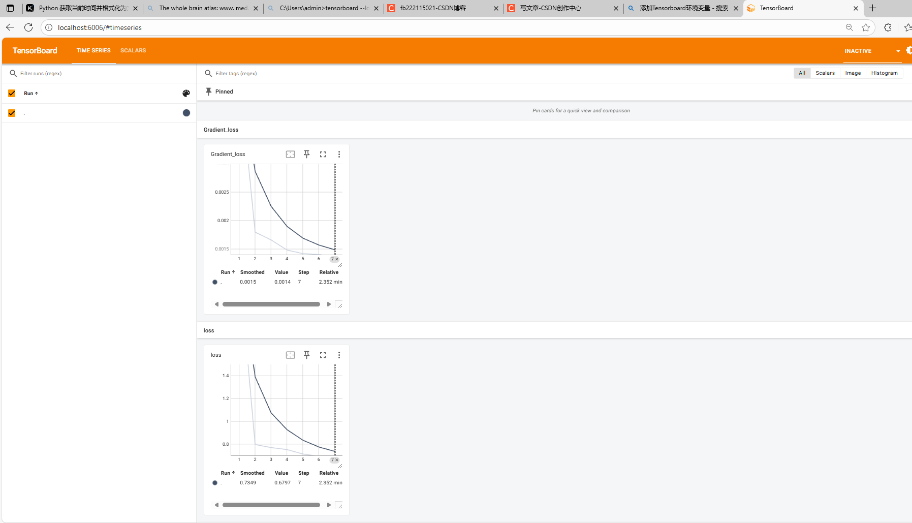 直接在命令行中运行python -m tensorboard.main --logdir=path(这个path就是loss_tensor_board = SummaryWriter(path) 这里路径)