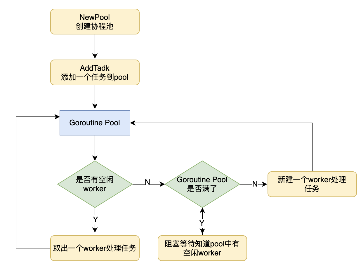 AddTask方法是往协程池添加任务,如果当前运行着的worker数量小于协程池worker容量,则立即启动一个协程worker来处理任务,否则将任务添加到任务队列。