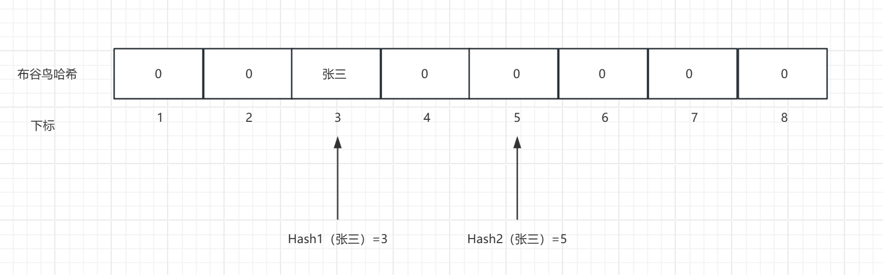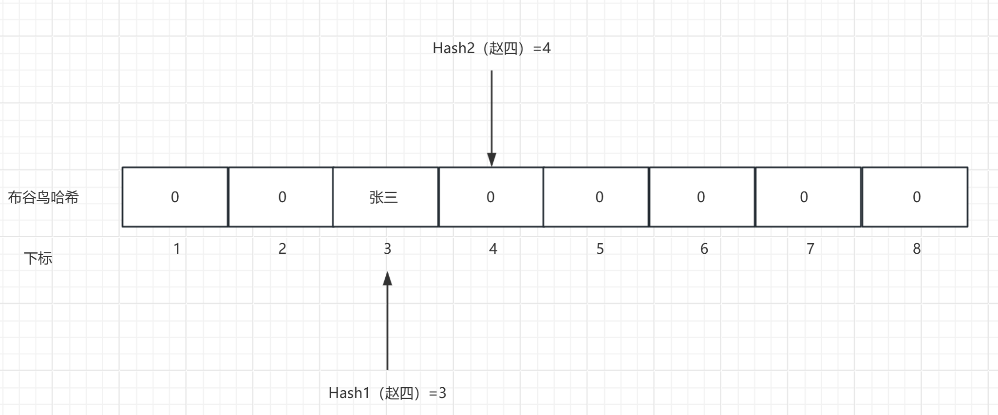 第一次插入元素:插入"张三",经过哈希后得到两个位置:3和5,选择位置3进行插入