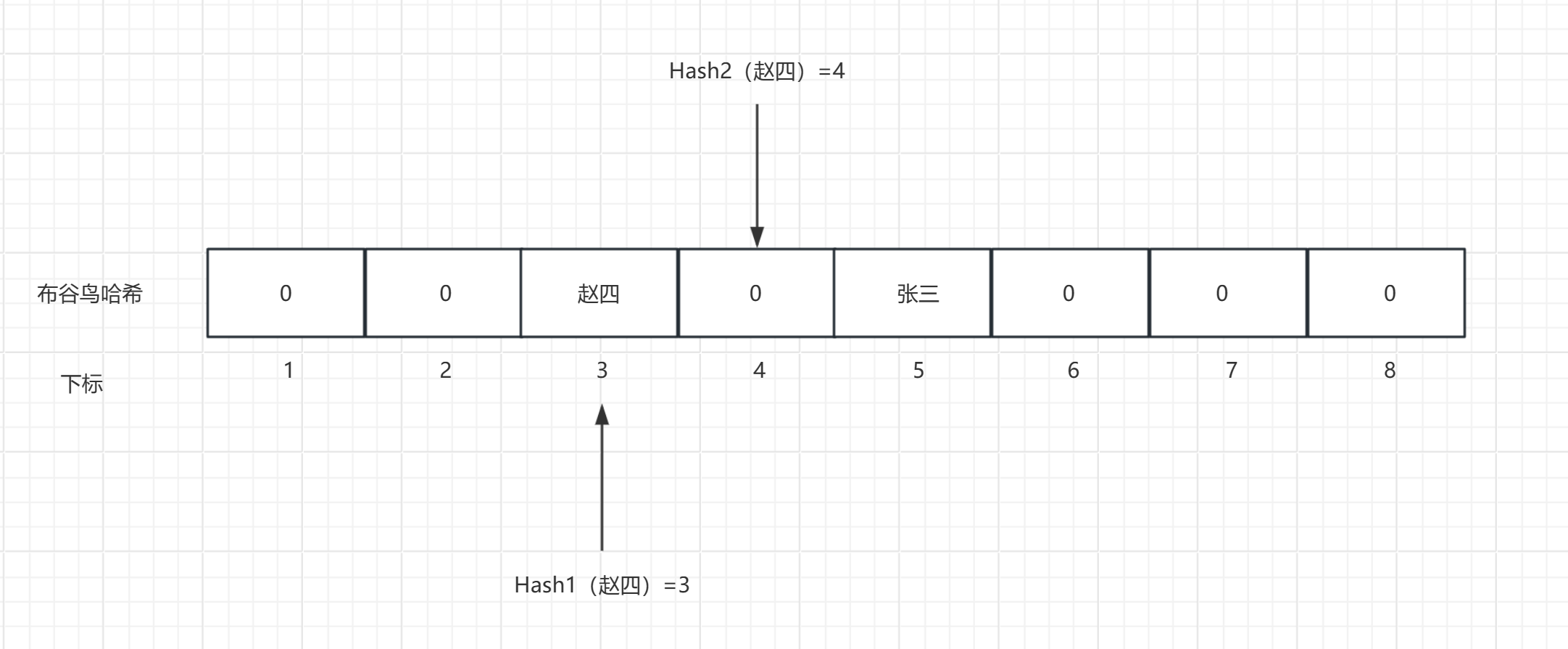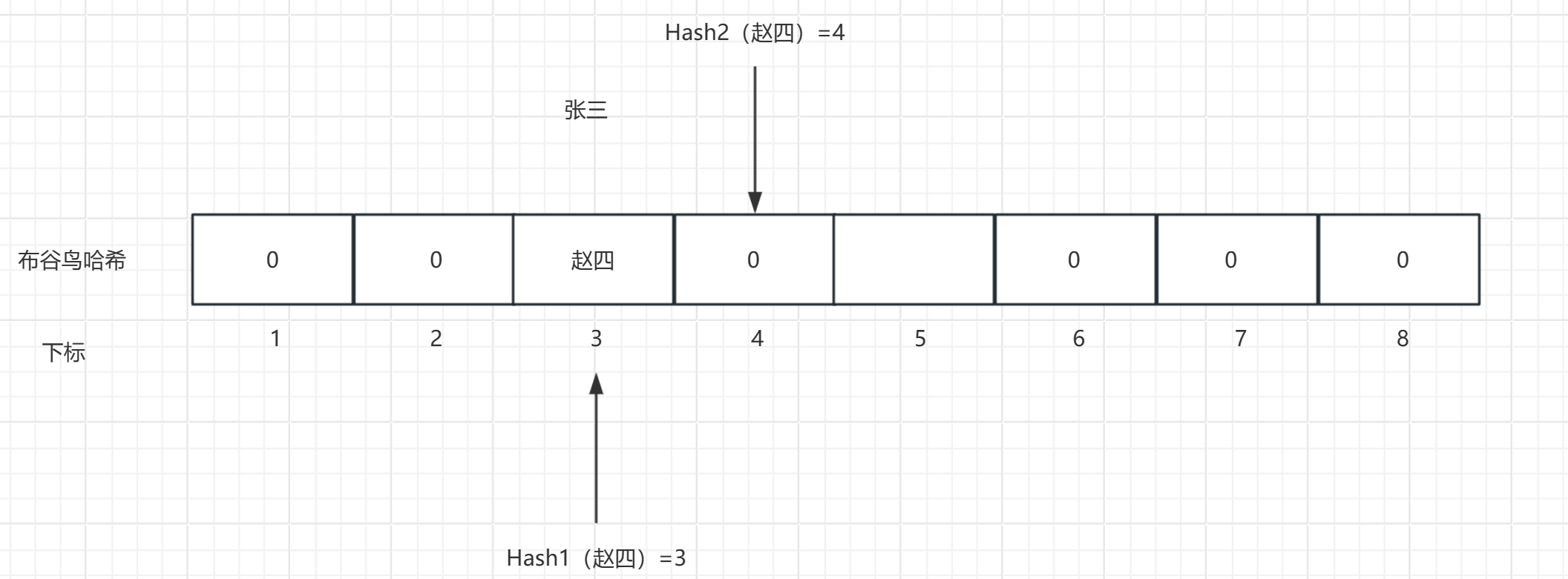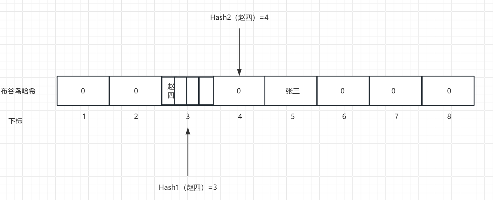 第二次插入元素 : 插入"赵四",经过哈希后,得到两个位置3和4,选择位置3进行插入