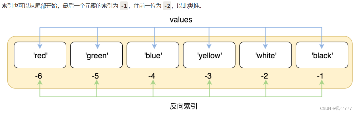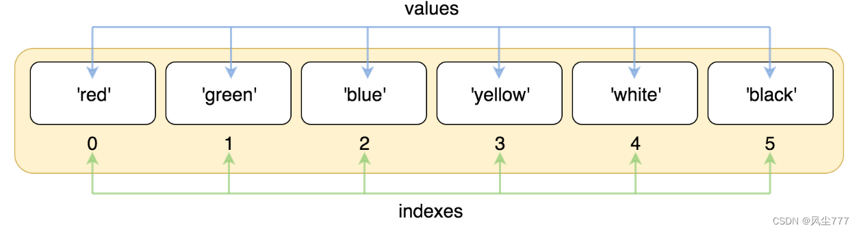 序列中的每个值都有对应的位置值,称之为索引,第一个索引是 0,第二个索引是 1,依此类推。