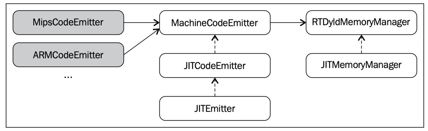 JIT 类以及其框架都是旧版的引擎,用了不同部分的 LLVM 代码生成器,在 LLVM 3.5 之后被移除,它是平台无关(target-independent)的,每种平台都需要实现自己的二进制指令生成操作。