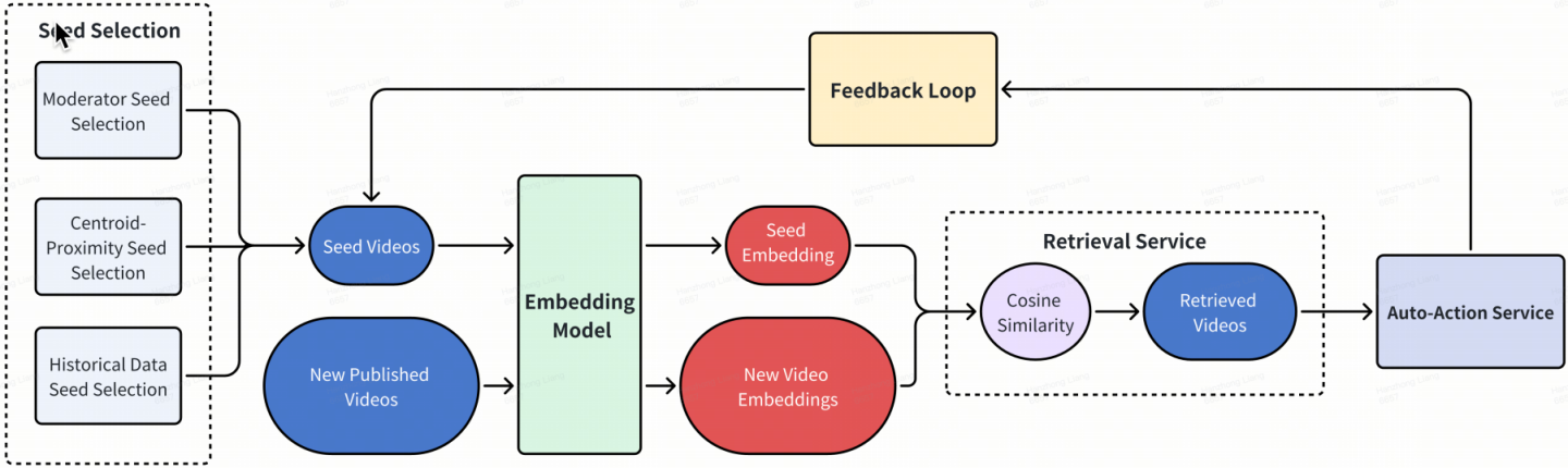 实现: 论文采用了一种基于嵌入的检索系统,而非需要大量标注数据的分类模型。该系统维护一个由高风险代表性视频构成的种子库(Seed Bank)。新上传的视频会与种子库中的视频进行语义相似度匹配,相似度高的被视为高风险候选。