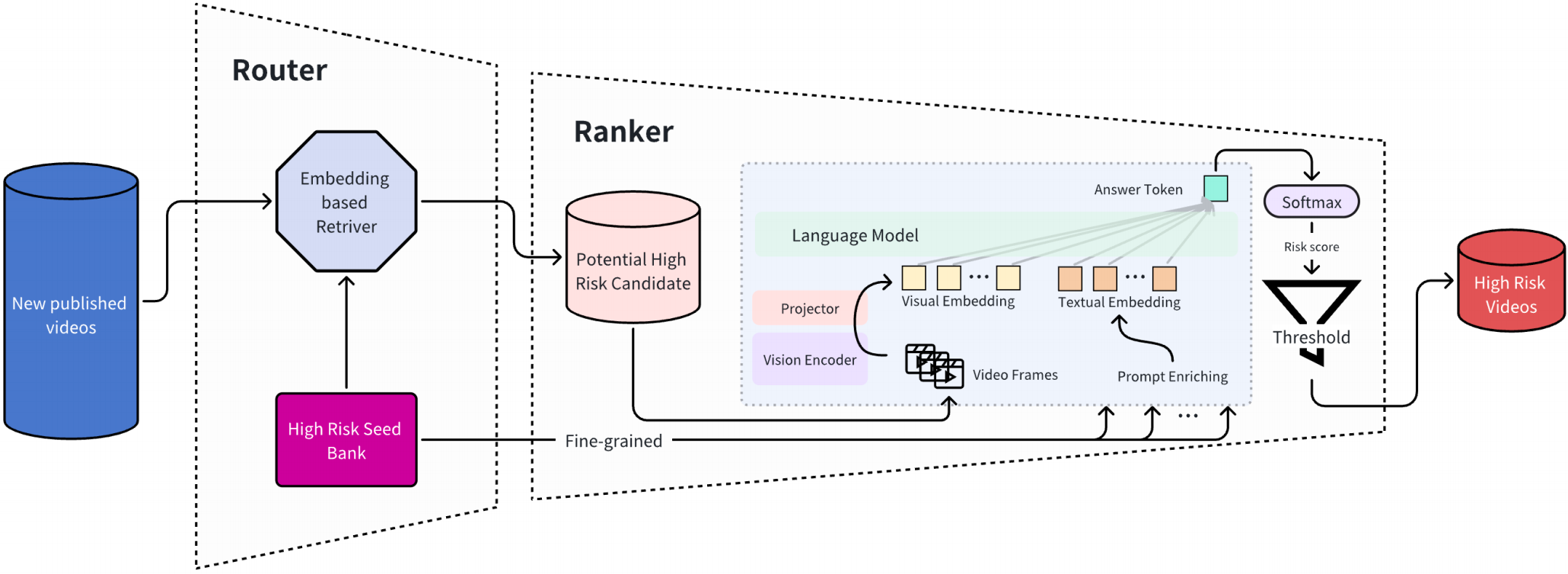 解决方案: 借鉴推荐系统中的“召回-排序”架构,设计了一个两阶段级联系统。首先用一个轻量级的路由器(Router)快速过滤掉绝大部分低风险内容,只将少量潜在高风险视频传递给后续昂贵的排序器(Ranker)MLLM进行精细判别。