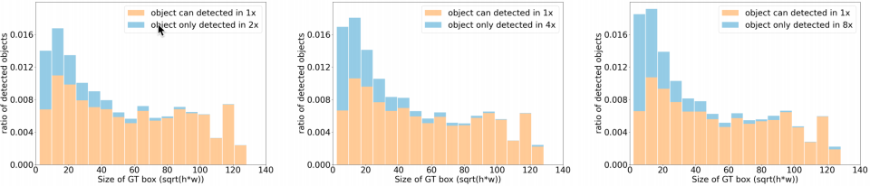 放大图像对微小物体检测性能提升显著,但对中大物体无效,甚至引入计算冗余。