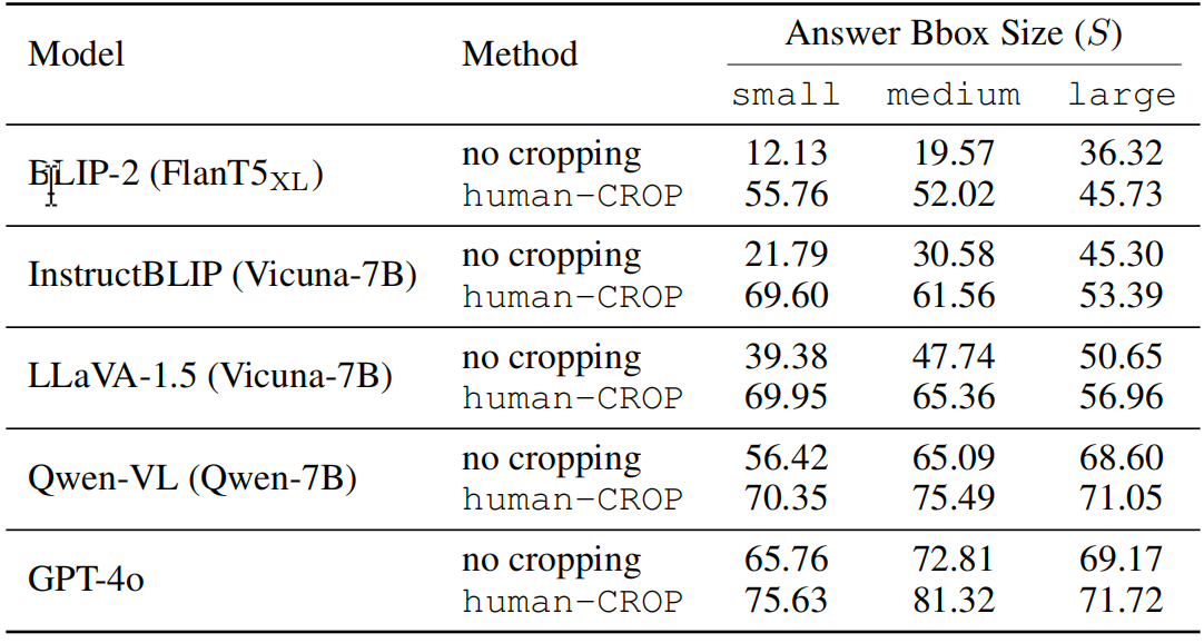 为了证明这种性能下降是尺寸“导致”的,而非仅仅是相关,作者进行了干预实验:直接根据真实答案框裁剪图像(称为 human-CROP),并将裁剪后的图像连同原图一起输入模型。结果发现,这种人工裁剪显著提升了所有模型在“小”和“中”组上的性能。这表明,视觉概念的尺寸是导致感知困难的因果因素,而视觉裁剪是可行的解决方案。