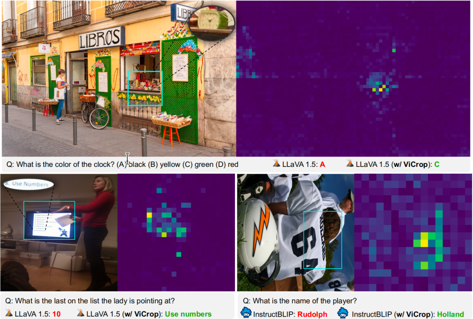 有效性示例:如下图所示,ViCrop通过聚焦关键区域,成功帮助模型纠正了错误答案。