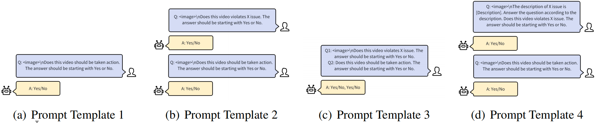 论文设计了四种不同的提示模板,主要区别在于如何询问视频的细粒度违规标签和整体处置标签(是否需要采取行动)。
