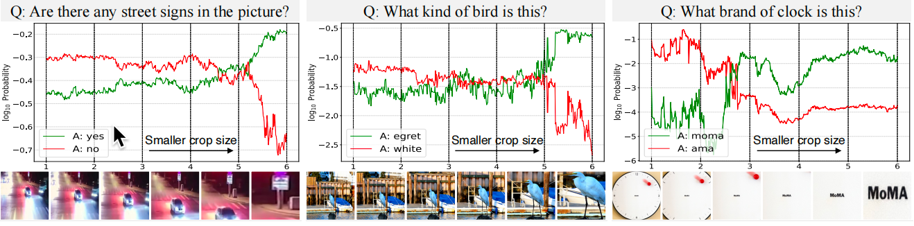 多模态大语言模型在多种视觉语言任务上取得了显著进展,并被应用于机器人、自动驾驶等关键领域。因此,深刻理解其视觉感知的局限性至关重要。当询问MLLMs关于图像中一个尺寸较小的物体(如路牌、鸟类)时,模型可能无法正确识别或给出低置信度的答案;然而,当图像被裁剪放大,聚焦于该小物体后,模型给出正确答案的概率显著提升。