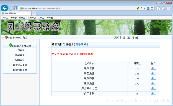 该博客详细介绍了使用JSP开发的网上投票系统,包括前后台功能划分。前台系统提供企业公告、投票管理、客户留言和新闻浏览等功能,后台系统则包含公告管理、新闻管理、留言管理、投票项目设置和投票选项管理等模块,实现了网站内容的动态管理和更新。