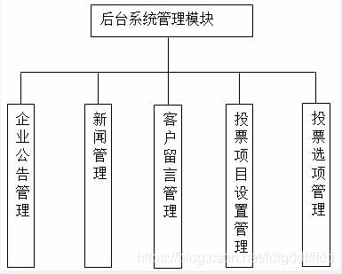后台系统可分为公告管理、新闻管理、留言管理、投票项目设置、投票选项管理。后台系统功能模块图如图4-2。