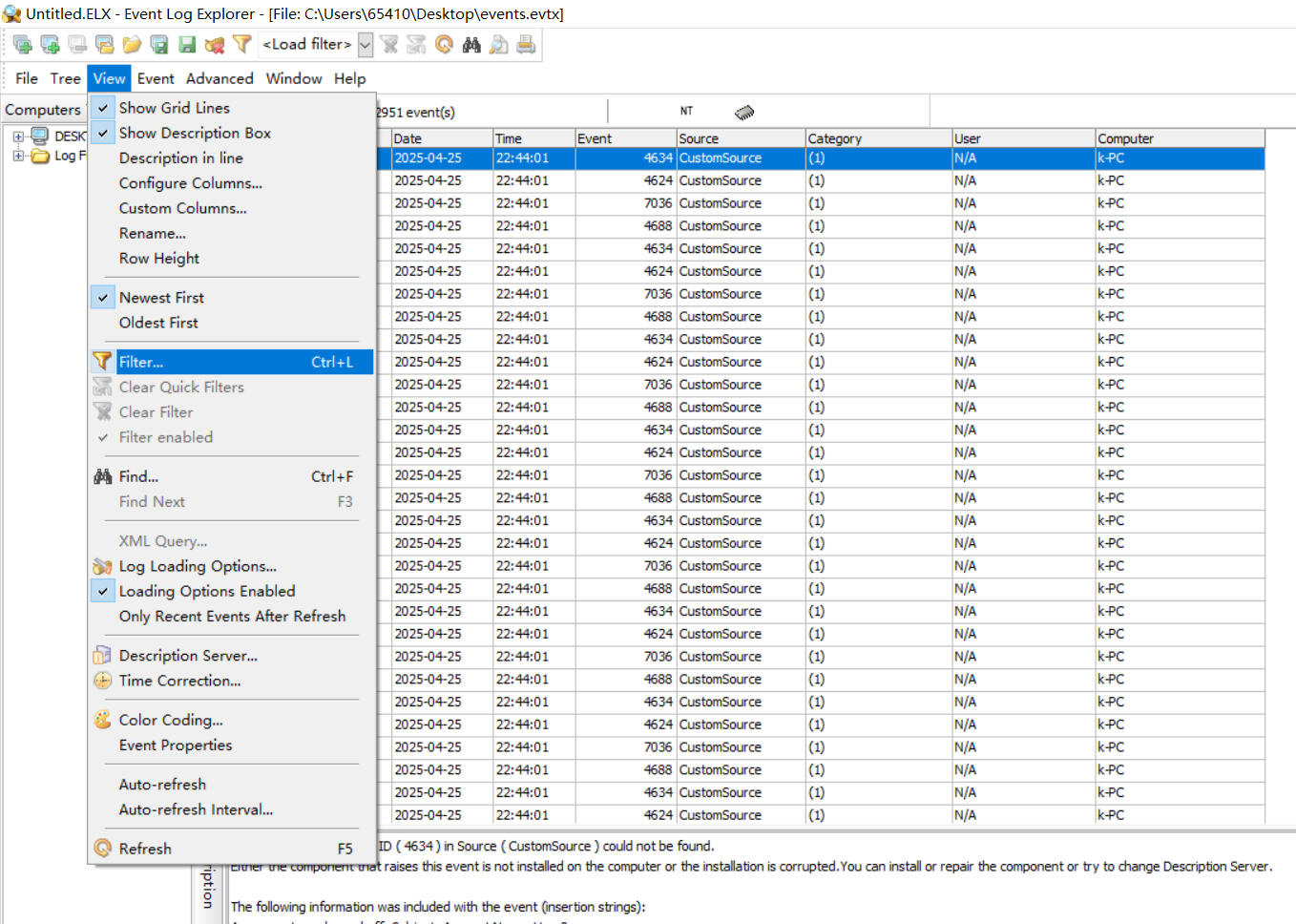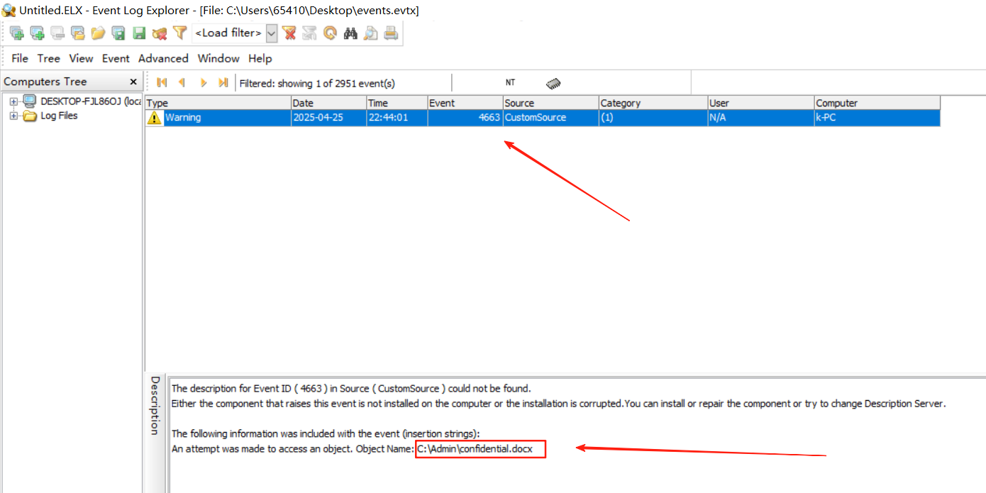 第二步,分析题目,题目说攻击者访问成功的一个敏感文件,我们需要找到这个文件名。课堂上我们讲过,事件ID4663:文件系统操作(详细文件访问),事件ID4656:请求访问对象(通常是文件),那么我们先根据4663进行筛选。