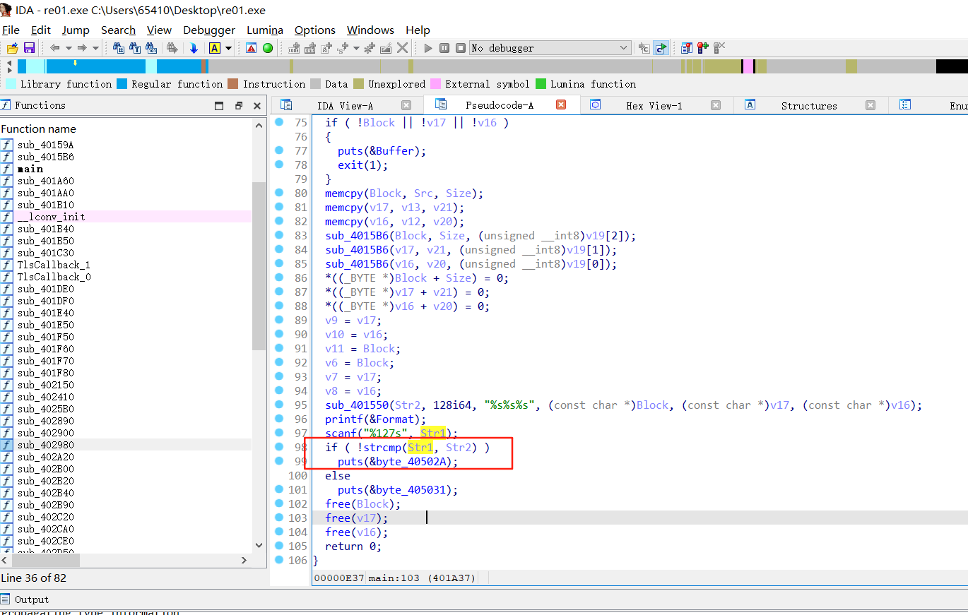 第二步,IDA64位打开,拖入IDA分析,发现会将我们的input与enc进行比较。这类题目课堂上讲过多种解法,最快的就是动调。