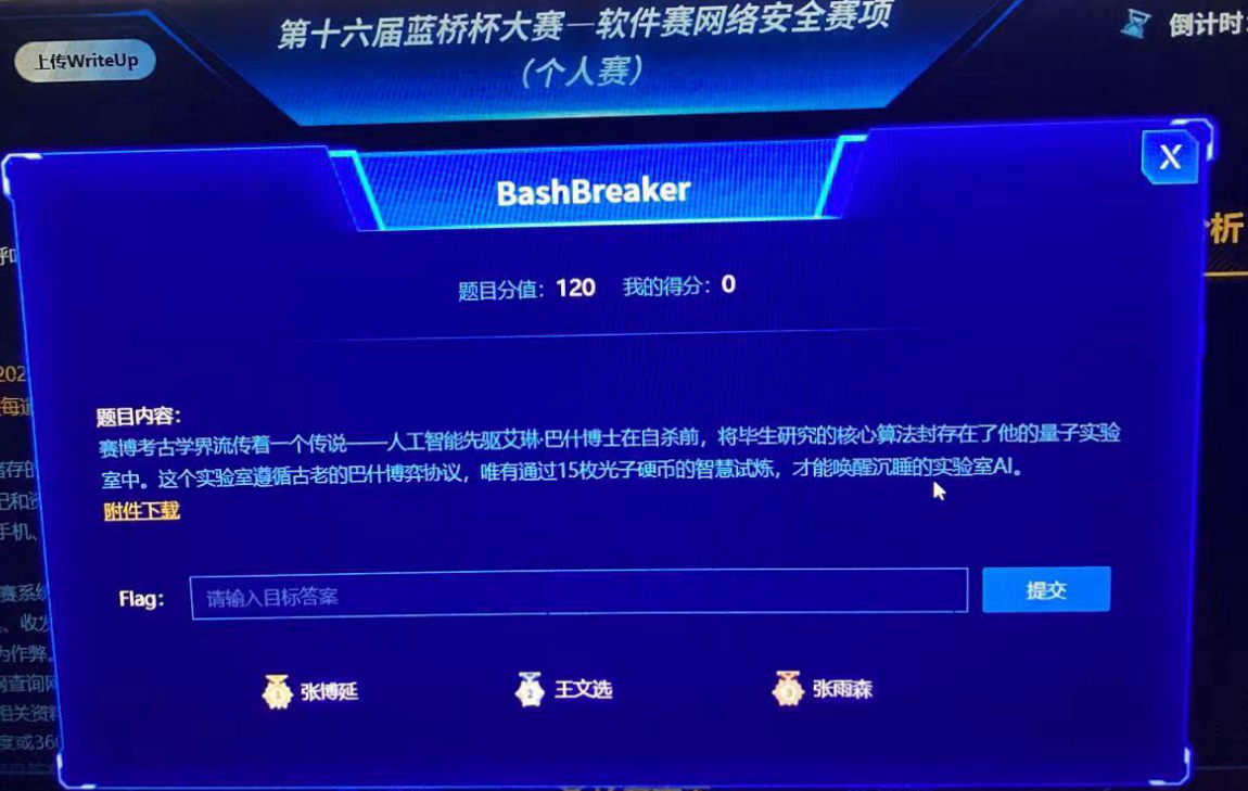 赛博考古学界流传着一个传说——人工智能先驱艾琳·巴什博士在自杀前,将毕生研究的核心算法封存在了他的量子实验室中。这个实验室遵循古老的巴什博弈协议,唯有通过15枚光子硬币的智慧试炼,才能唤醒沉睡的实验室AI。赛题原题及工具资料下载地址:www.whsjyc.cn