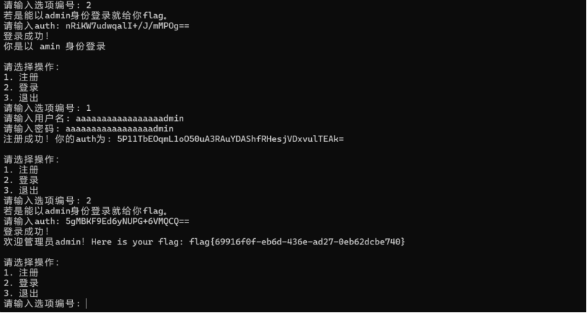解题思路:第一步,第一次注册аааааааааааааааааdmin,这个账号由16个字符a和5个字符admin组成,所以加密是16个字符a为第一个独立块,admin为第二个独立块。第二步,第一次注册返回的是AES加密后的base64编码,我们获取AES密文的最后16字节就是admin加密后的密文auth。第三步,最后用这个密文的base64编码输入2登录即可获得flag。