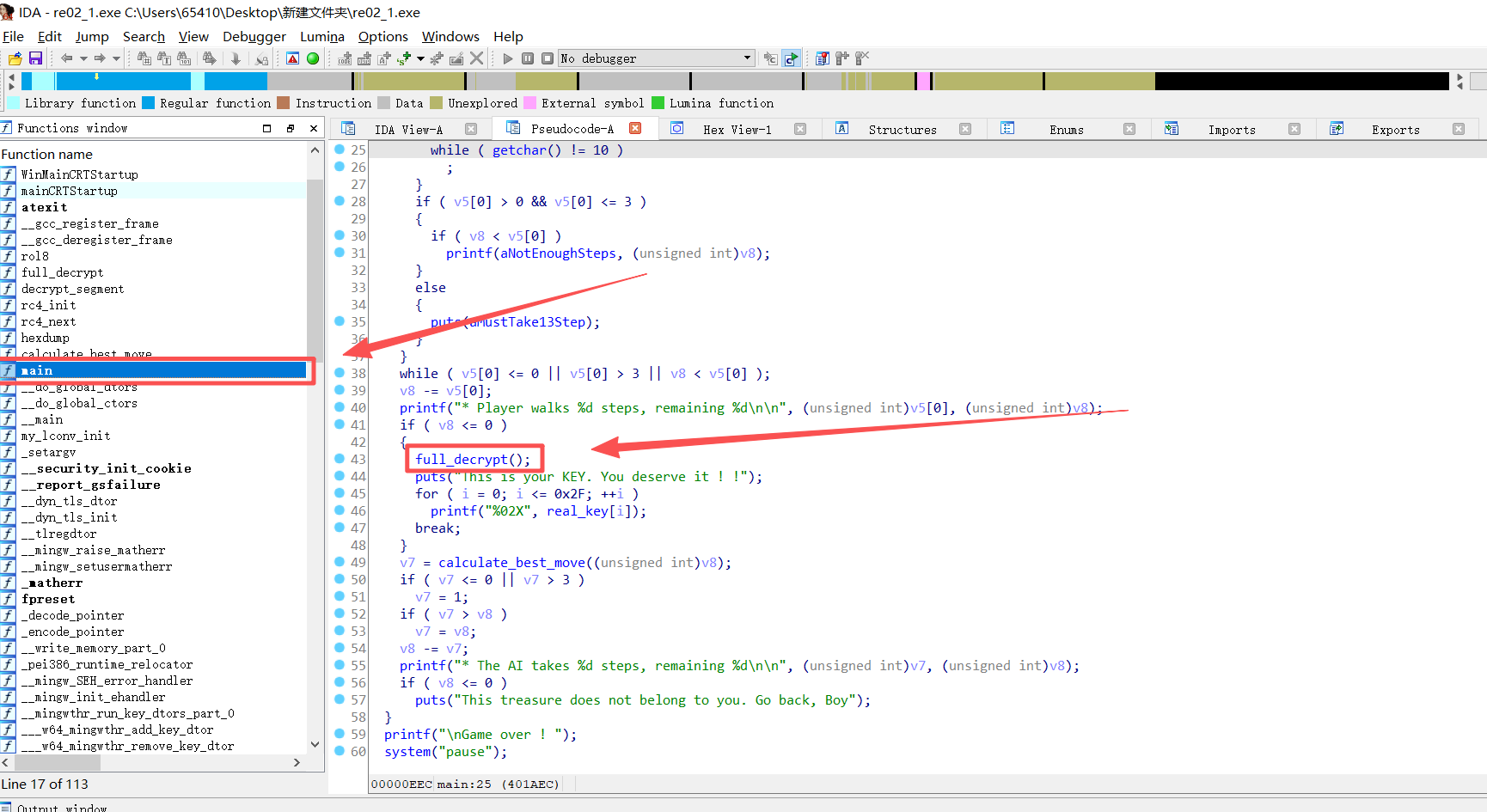 第二步,IDA64位打开,拖入IDA分析,找到main函数后发现有一个key解密函数: