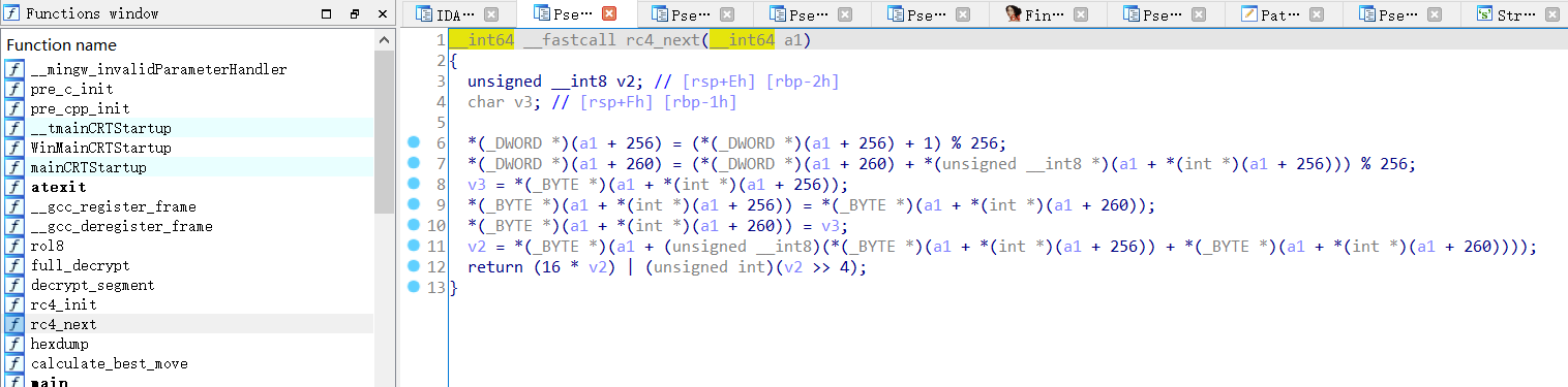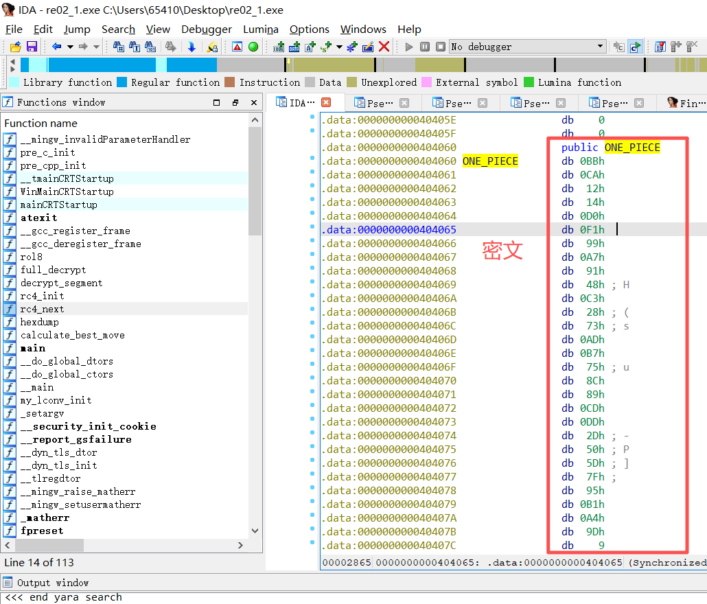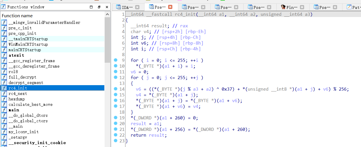第四步,找到变异的rc4函数(rc4_init和rc4_next函数多一个异或0x37,),以及密文: