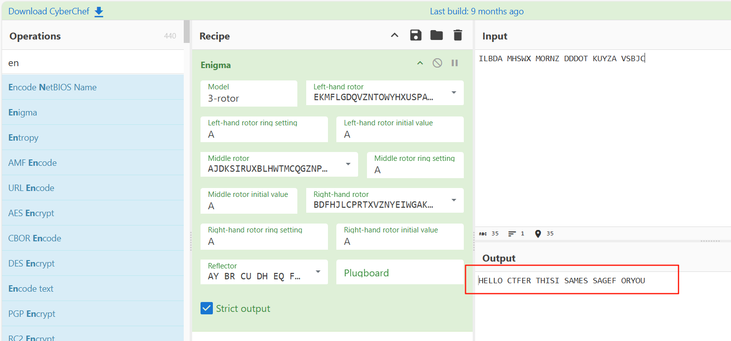 这道题目比我上课时候讲的恩尼格码加密简单多了,我上课的题目要编程写脚本,这道题目直接用赛博厨师直接一步解,就可以拿到flag。打开Cyberchef,选择Enigma加密算法。放入密文,发现直接出现了明文,怀疑可能是对称加密。flag{HELLOCTFERTHISISAMESSAGEFORYOU}