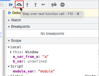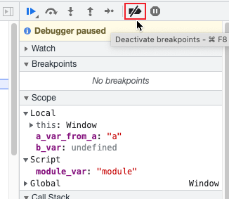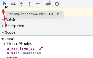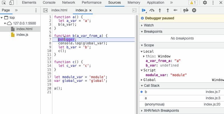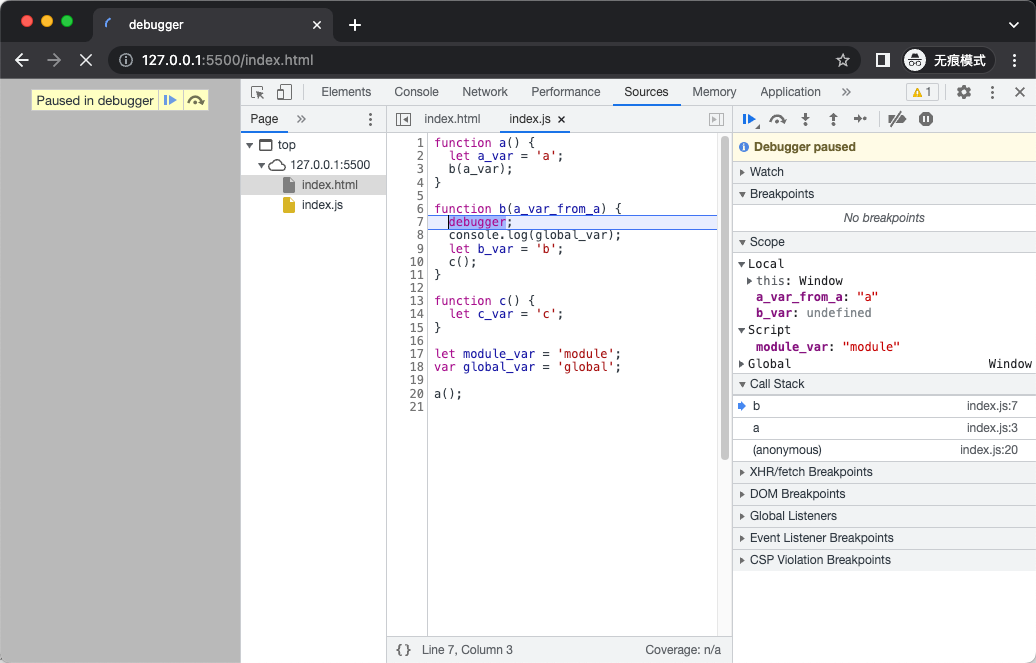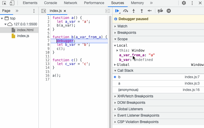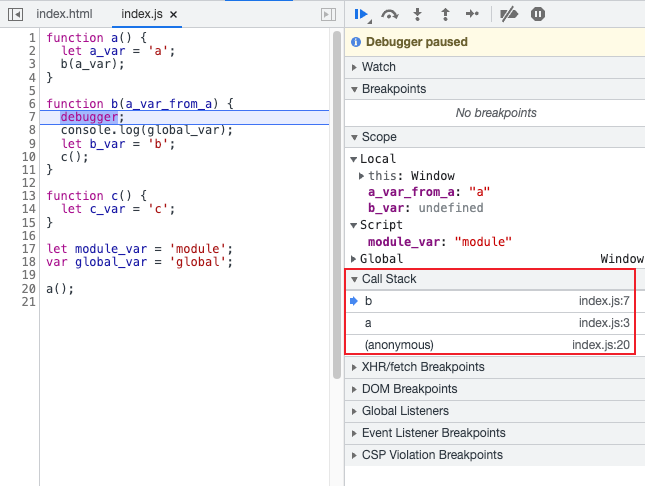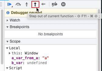 现在是 a 函数调用了 b 函数,b 函数调用的时候用 debugger 加了个断点,于是我们就停在这里了。