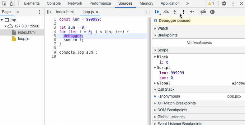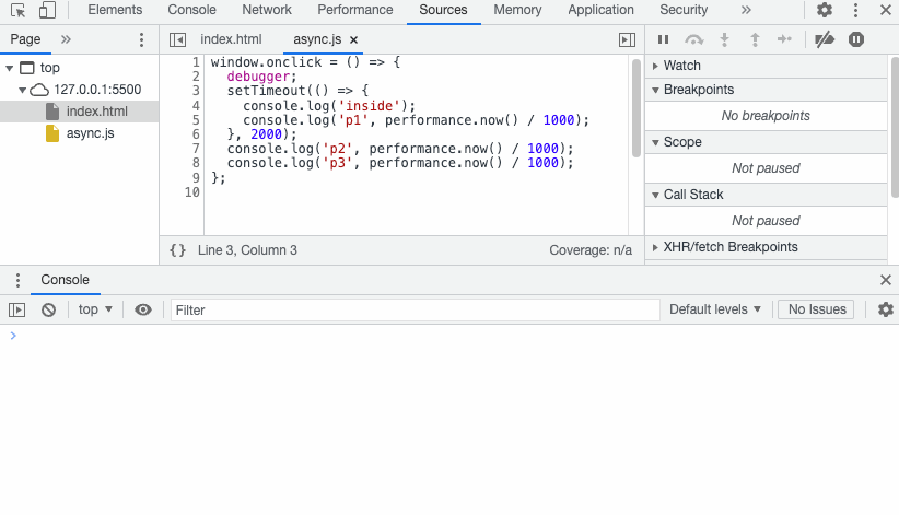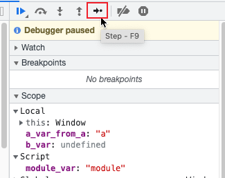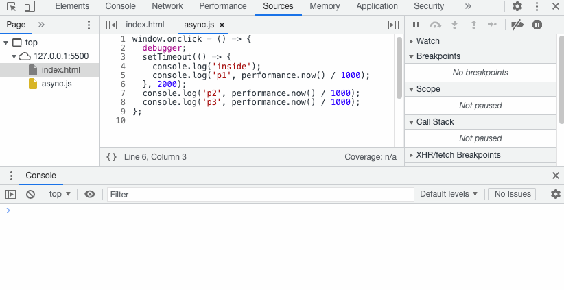 可以看到,Step into 会等待异步函数被执行,才进入到函数内部,然后停在它的首行。