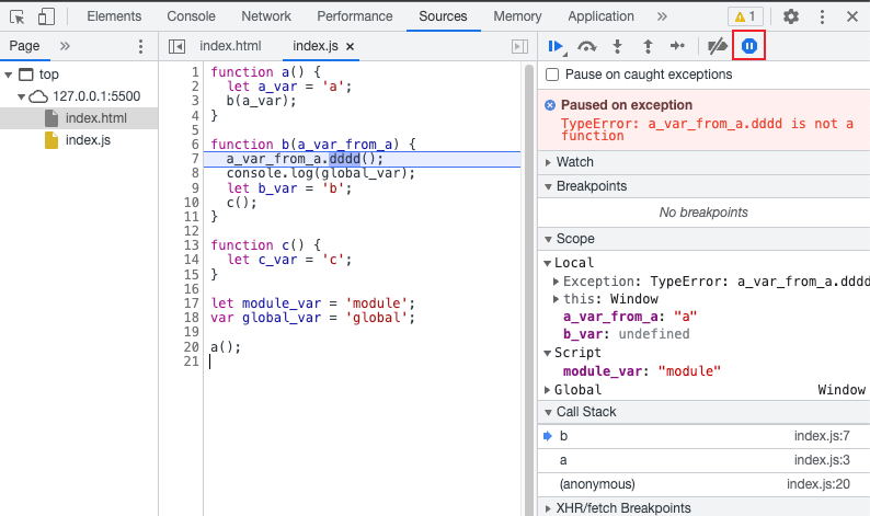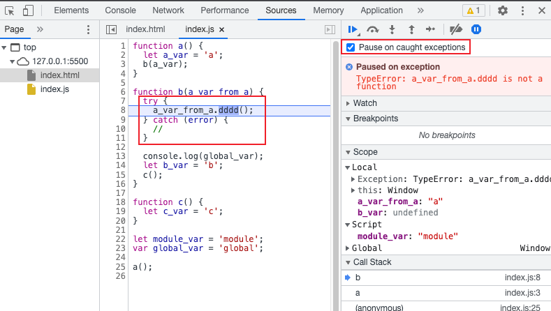 还可以勾选这个 Pause on caught exceptions,效果是错误被捕获时,打断点: