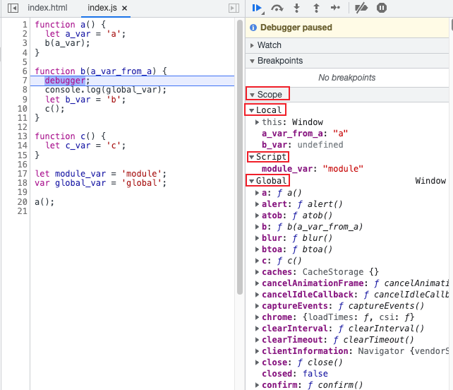 首先是 Local,本地作用域。这里对应 b 函数的上下文,可以看到(1)传入的变量,(2)函数内部声明的变量,以及 (3)this 值。