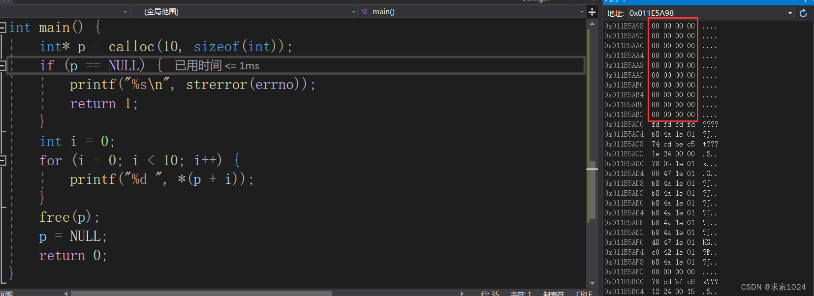 - 与函数malloc的区别只在于calloc会在返回地址之前把申请的空间的每个字节初始化为全0