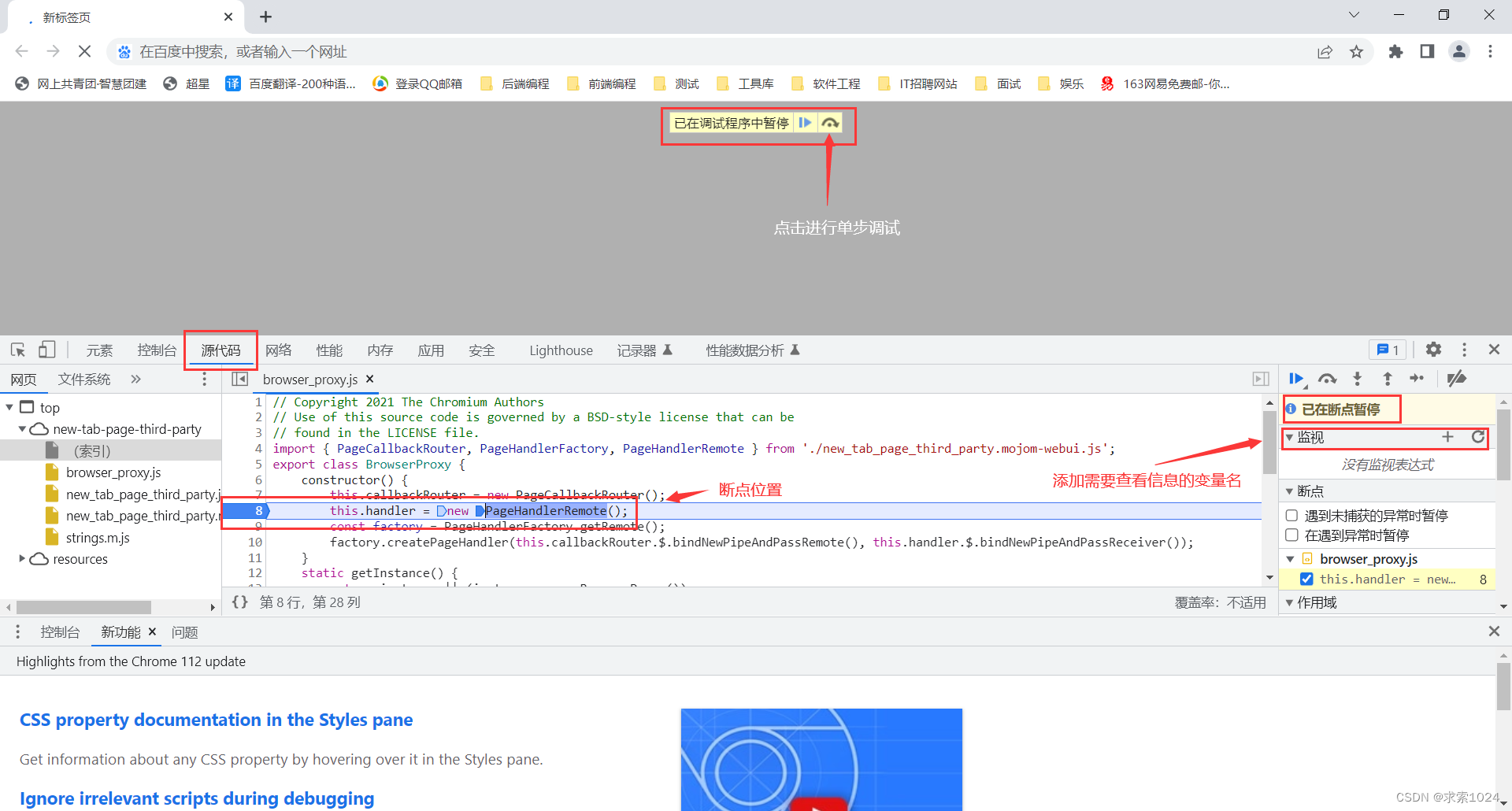 - 前端代码调试,开发者工具中的 Sources ,可以打开某个 html 文件,在左侧打断点,当出现蓝色标签时表示打断点成功,然后在网页上输入信息点击按钮执行,代码会停到断点位置