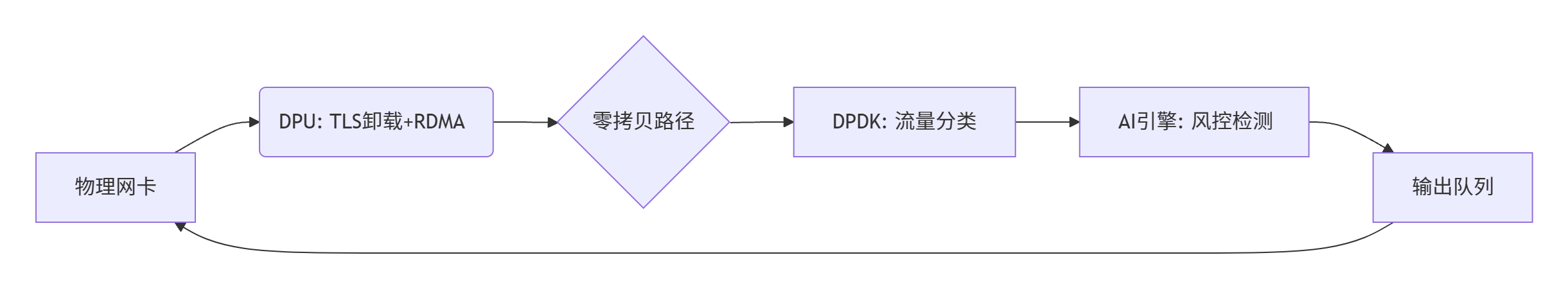 - DPU处理 → 2. PCIe传回 → 3. DPDK应用 → 4. 业务处理
