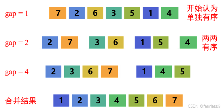 通过这种方式,每次循环中子数组的大小都会翻倍,从而逐步合并更大的子数组,直到整个数组被排序。