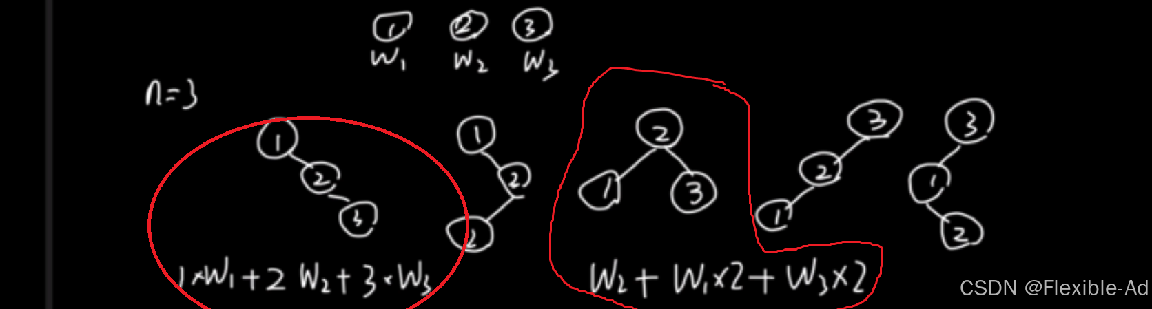 再举一个例子,以下为n=3的求解,可以发现,当n越大时我们要列举的可能性越来越多,那么,怎么样才能更快速地找到最优二叉树的排列情况呢?