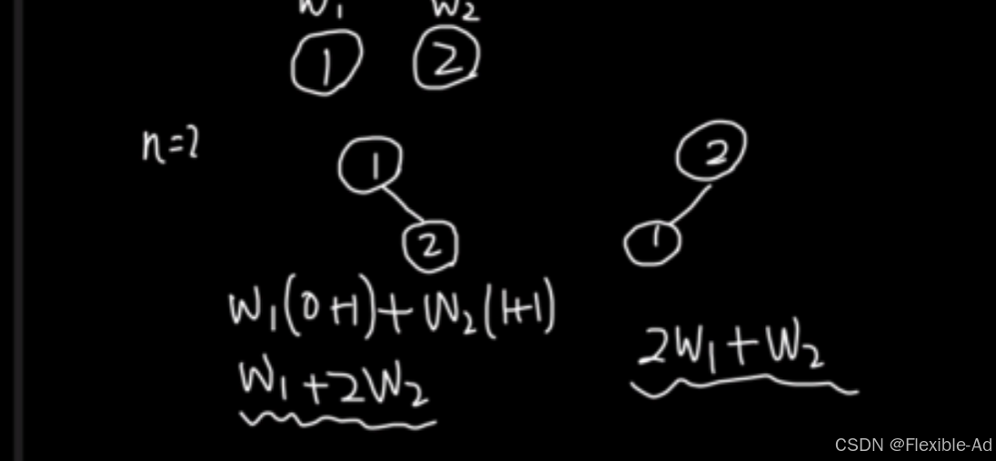 假设有两个结点1,2。对应权值为W1W2,那么,有两种排序方式,如下图,计算公式为:该结点权值×(结点深度+1)。然后取两种情况中的较小值,便是我们要求的数。
