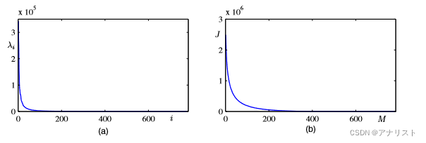 到目前的讨论中,都假定PCA主子空间的维度M已知,现实中我们必须选择合适的值,为了可视化,一般选取M=2,但在其他应用中,合适的M值并不清楚。一个方式是画出特征值光谱(如图3a所示),并查看是否天然形成了两个具有巨大差异的类别,其中一组值更小,另一组值更大,若成立,则意味着M的天然取值。现实中,这样的差异并不常见。